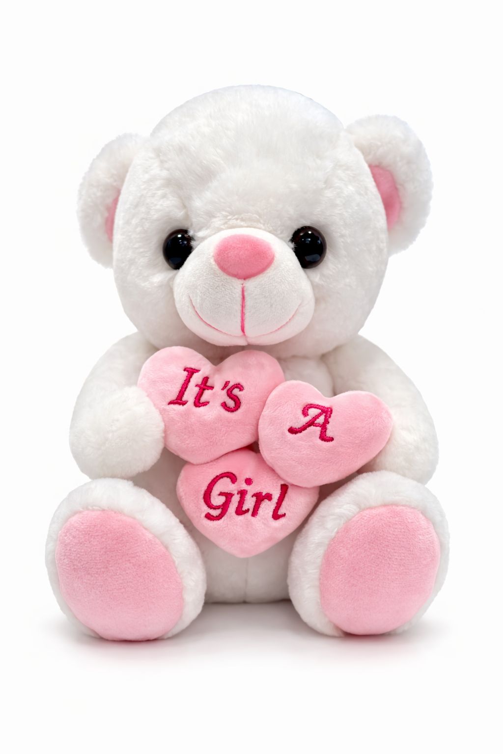 בגודל 25 ס"מ בצבע לבן המחזיק שלושה לבבות ורודים עם כיתוב "its a girl"