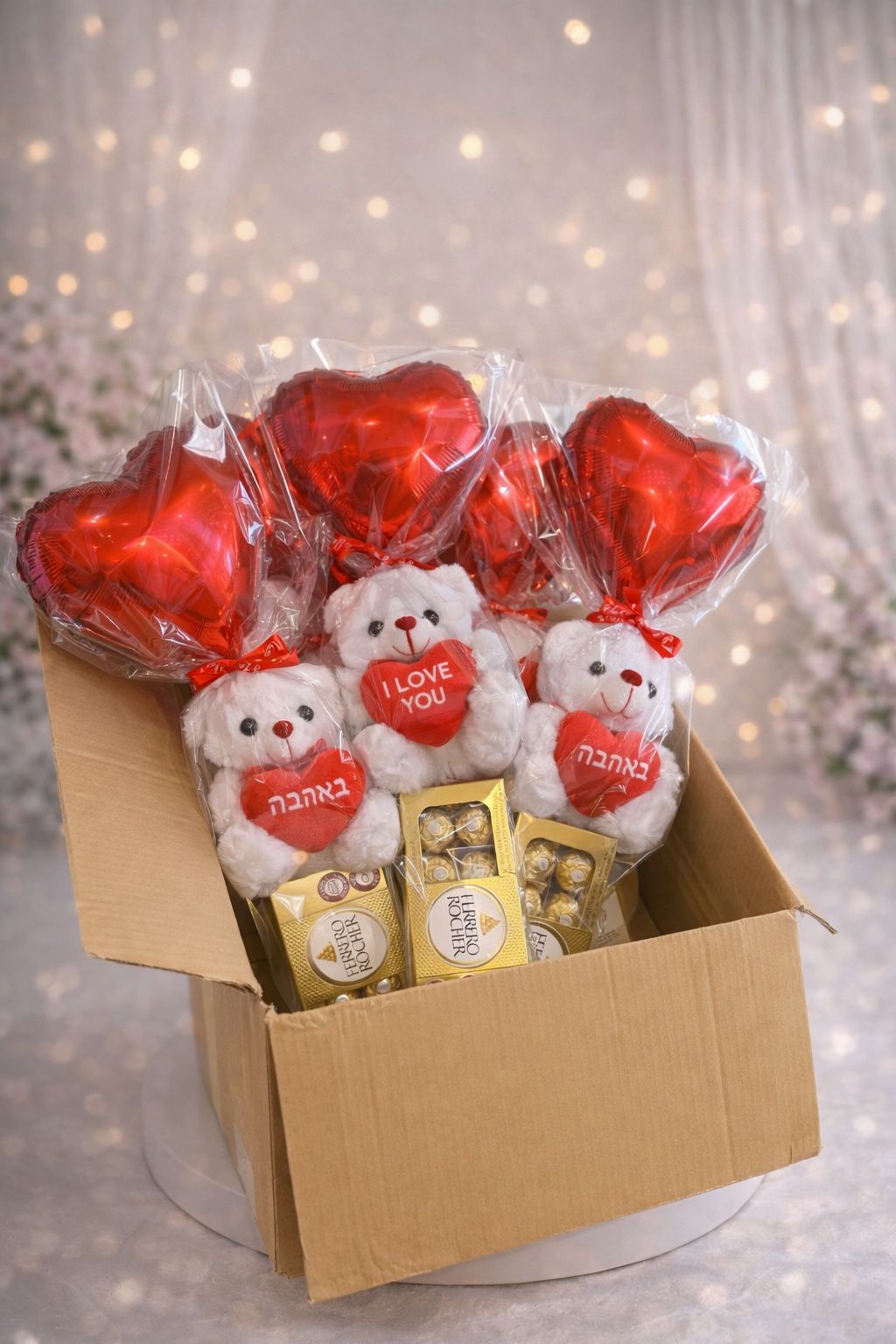 המארז כולל דובי רך עם לב אהבה, בלון לב אדום ושוקולדי פררו רושה, בעיצוב חגיגי ומרשים שמעלה חיוך מיד.