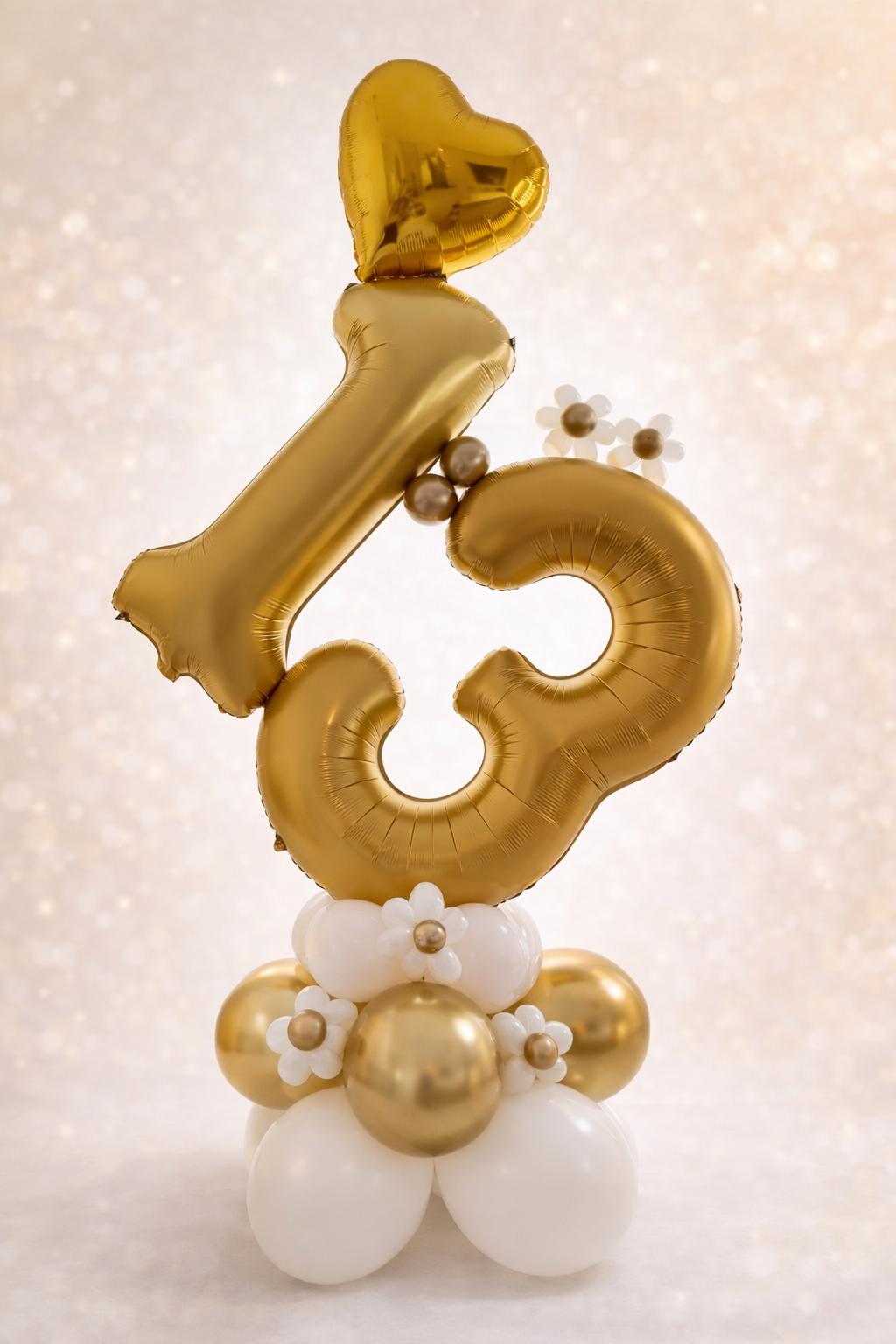 סטנד בלוני ספרות 13 בעיצוב פרחים זהב ולבן