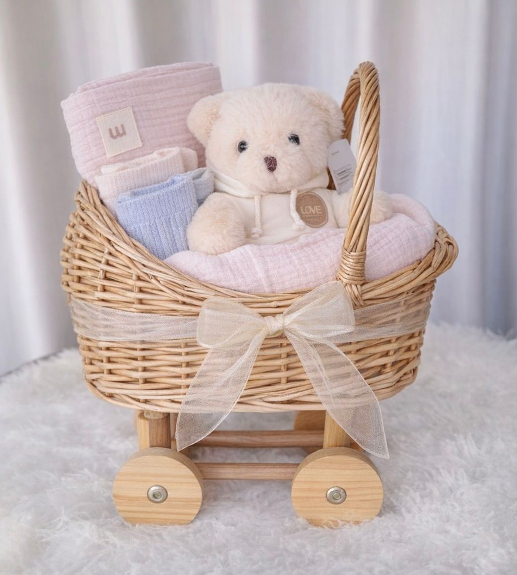 המוצרים מסודרים בתוך עגלת קש דקורטיבית על גלגלים, היוצרת מראה ייחודי ומתוק שמתאים במיוחד לצילומי ניו־בורן או כפריט עיצובי לחדר התינוק.