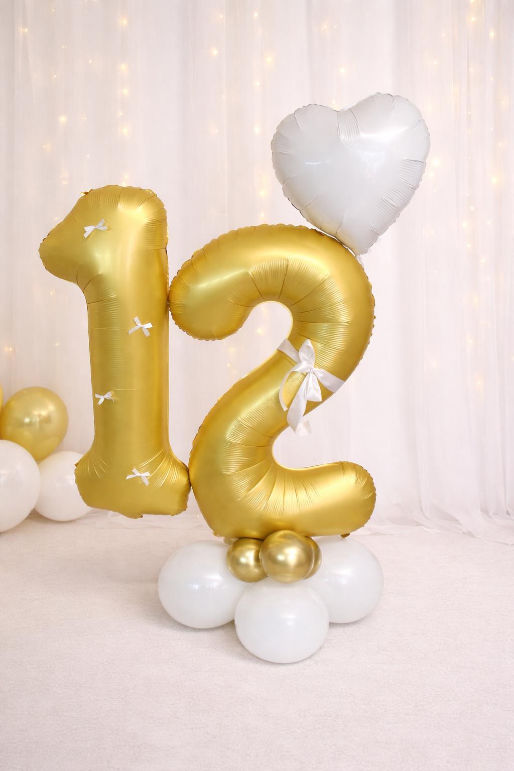 העיצוב כולל בלוני מספר 12 גדולים בגודל 34' בצבע זהב ובלון מיילר לב לבן בגודל 18'