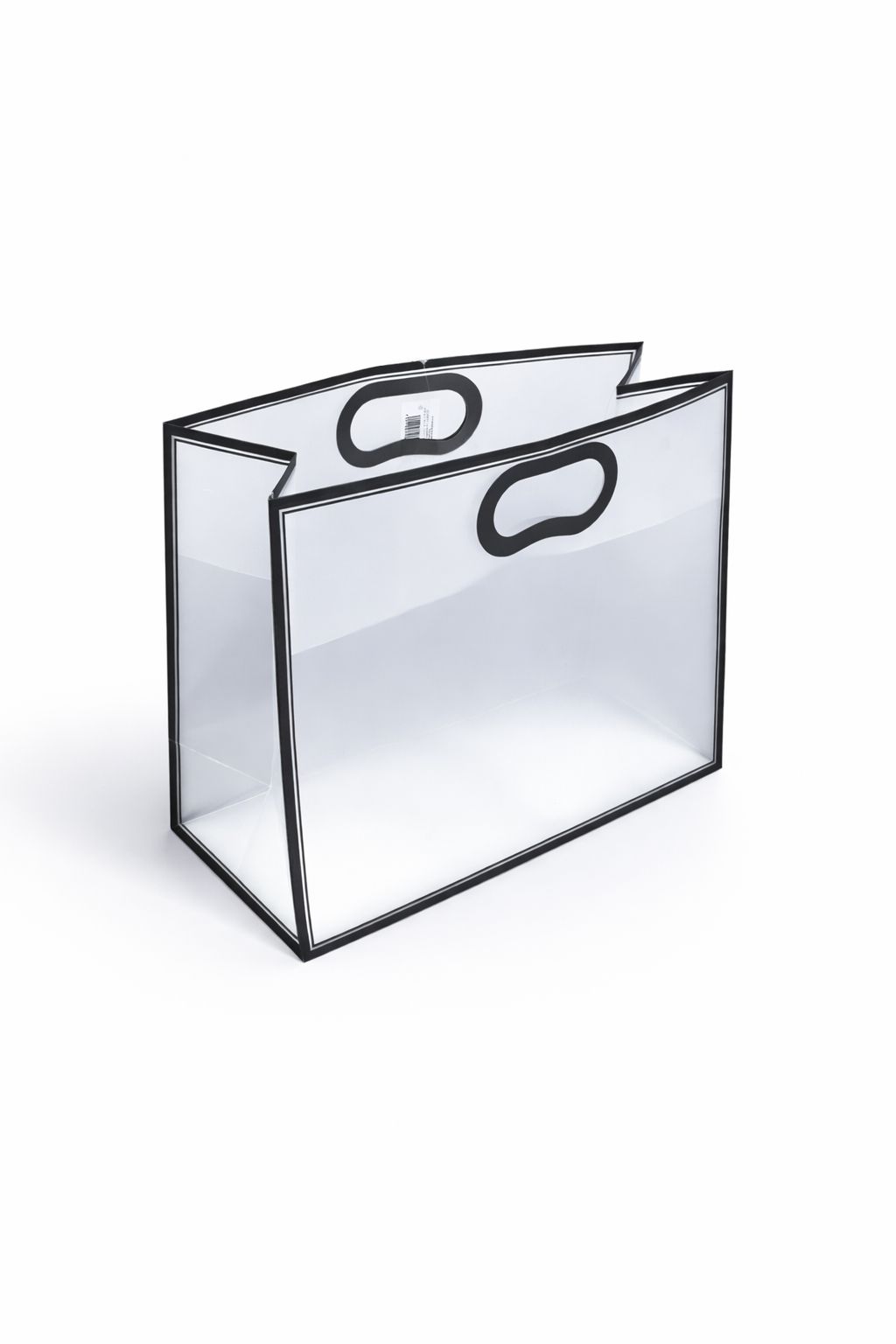 שקית מתנה יוקרתית ושקופה בעיצוב מודרני עם מסגרת שחורה אלגנטית וידיות אחיזה מובנות.