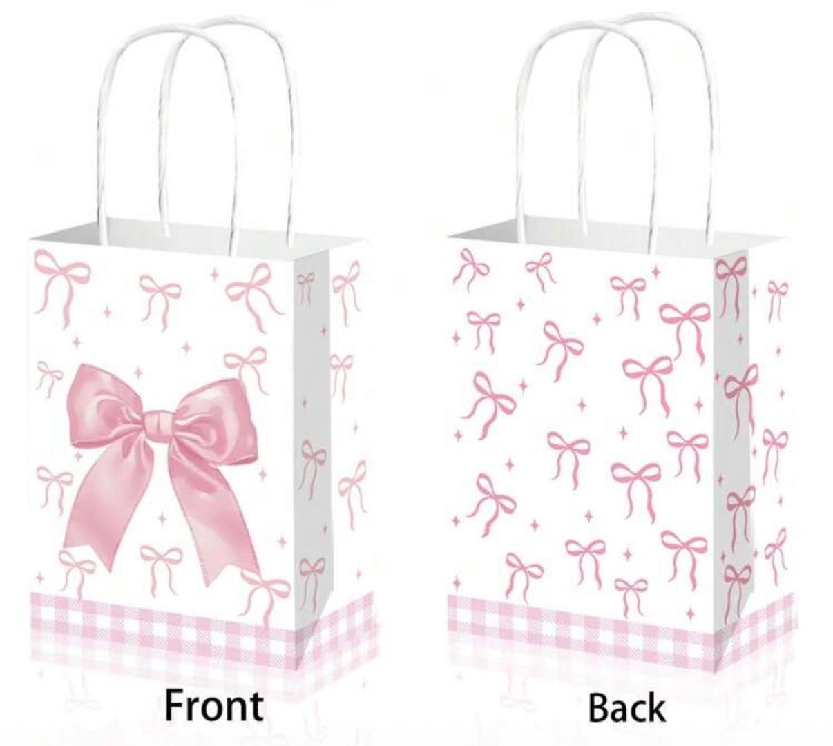 שקית נייר מעוצבת בצבע לבן עם הדפסי פפיונים ורודים ונצנוצים קטנים למראה חגיגי ומתוק.