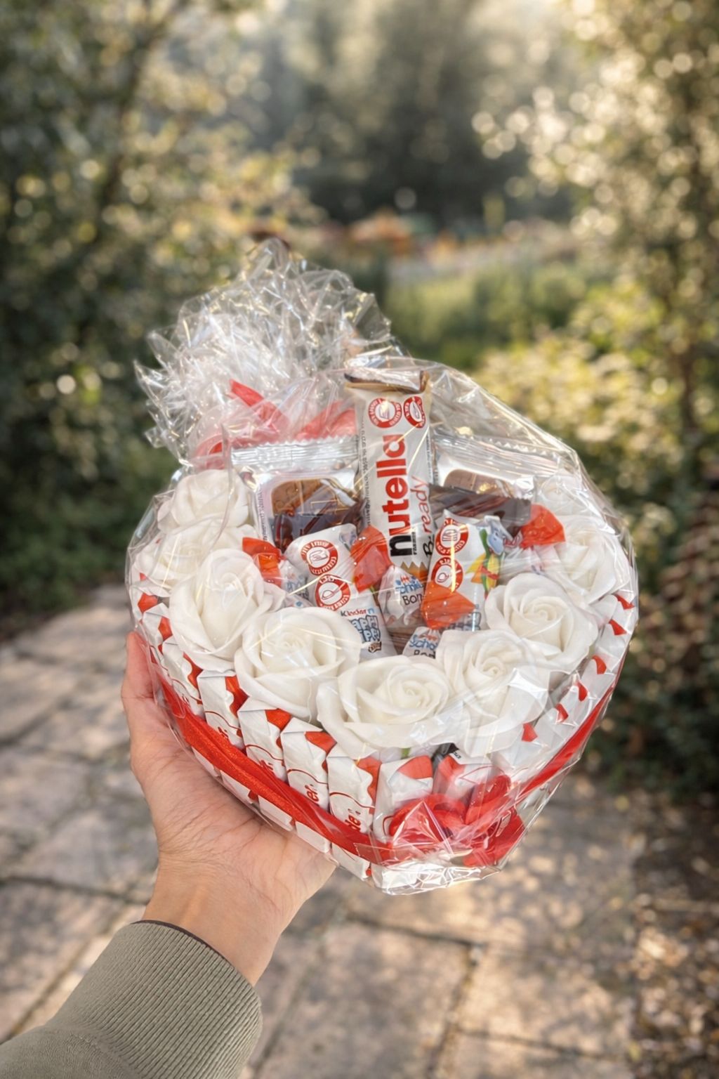 המארז משלב שוקולדים קינדר, נוטלה ופרחי סבון, היוצרים יחד מתנה יוקרתית, מרשימה ומלאת אהבה.